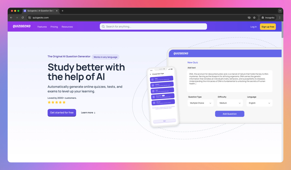 Quizgecko es una herramienta de inteligencia artificial (IA) que permite a los usuarios crear cuestionarios y pruebas de manera rápida y eficiente. Algunas de sus características clave incluyen: